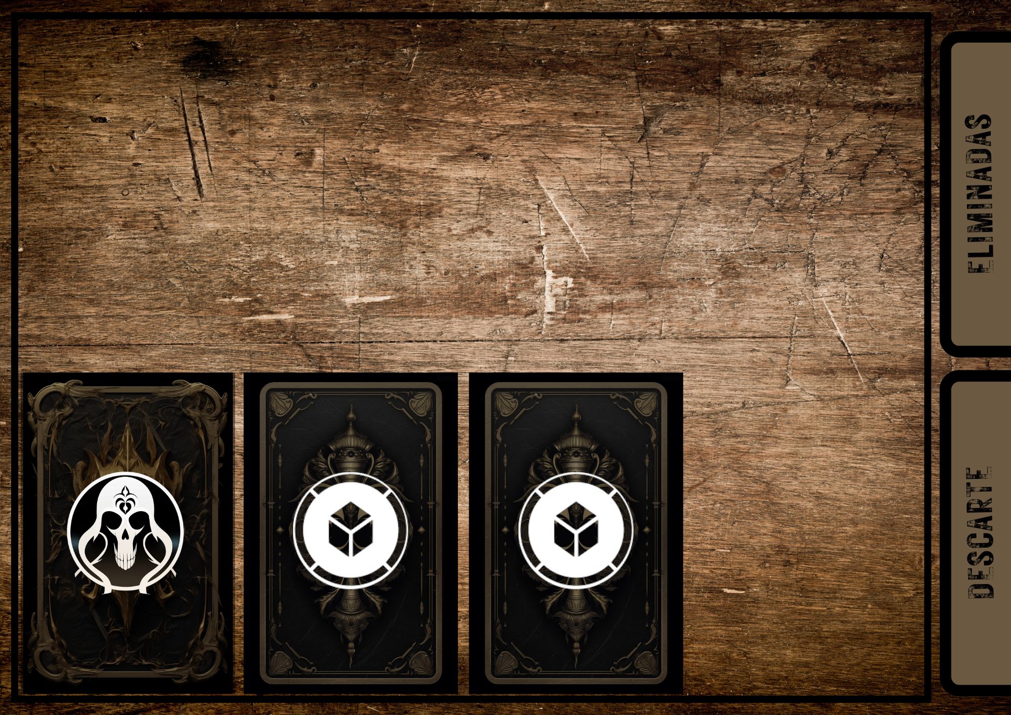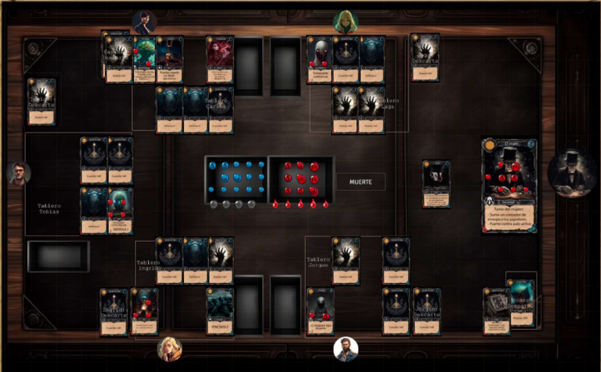Cada jugador contará con un tablero para las partidas de cartas, con espacios para el Alma que se jugará, los dos posibles objetos, la pila de descartes y eliminadas, y el tablero para los poderes a jugar.