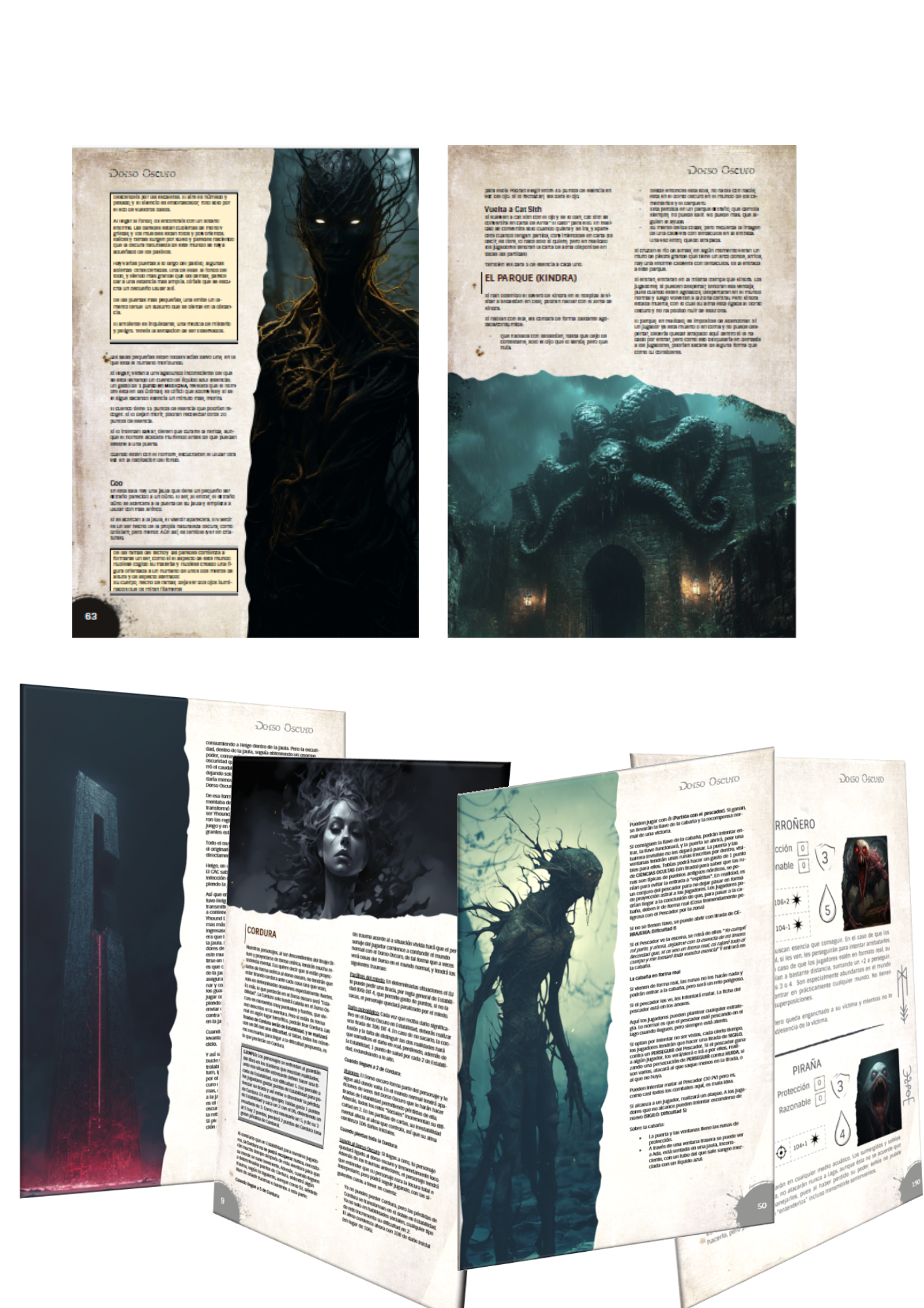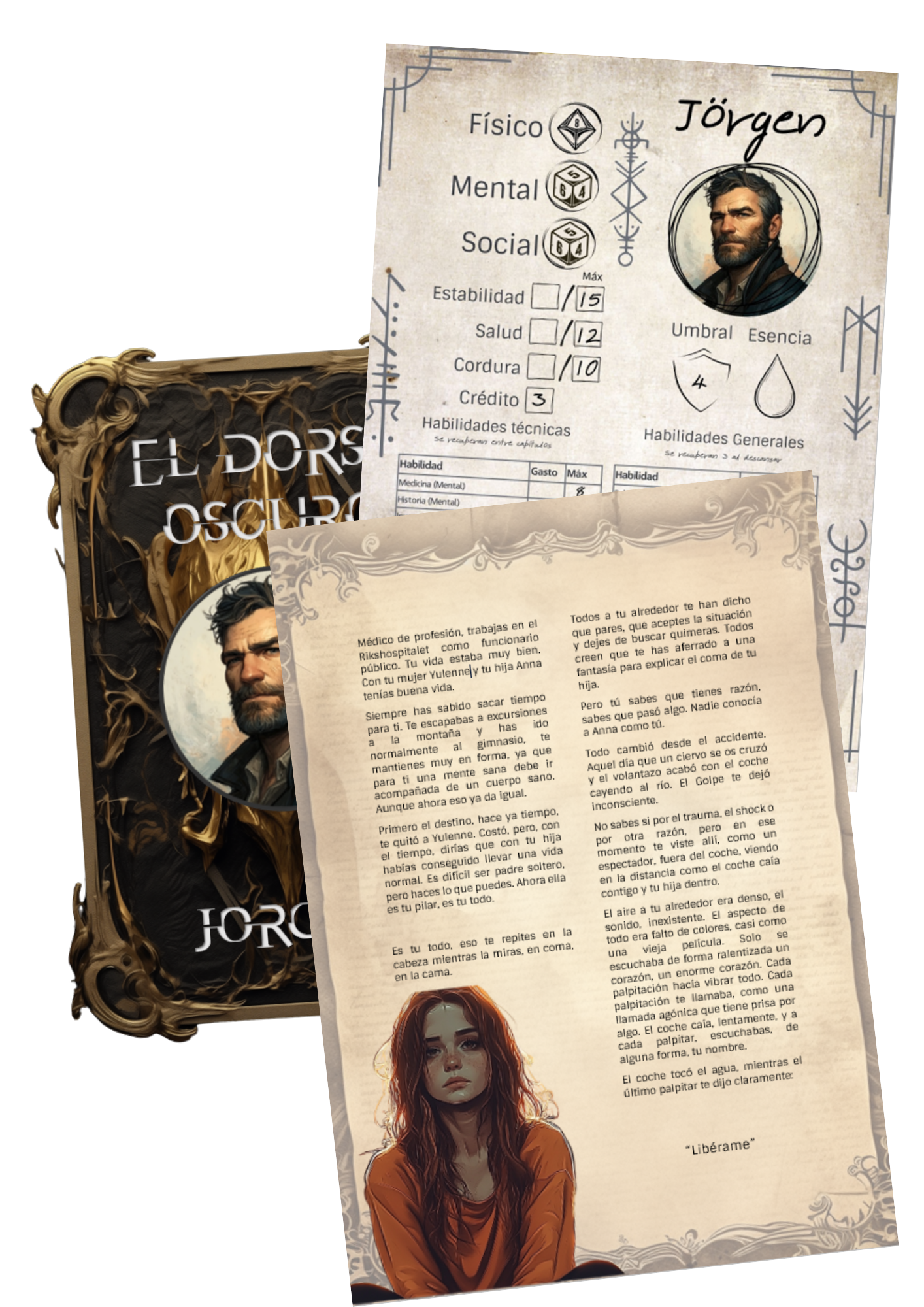 Dorso Oscuro es mucho más que un juego de rol. Es una aventura llena de material para crear un juego inmersivo, mezclado con partidas de cartas que harán que las investigaciones de los jugadores se vean recompensadas.