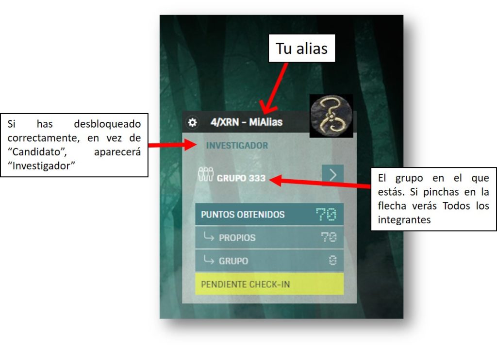 Hayas creado tu cuenta o tuvieses una ya, fíjate en el alias que pones porque lo usarás luego para Zoom. Si has desbloqueado la entrada correctamente, tu ficha de jugador será algo así: